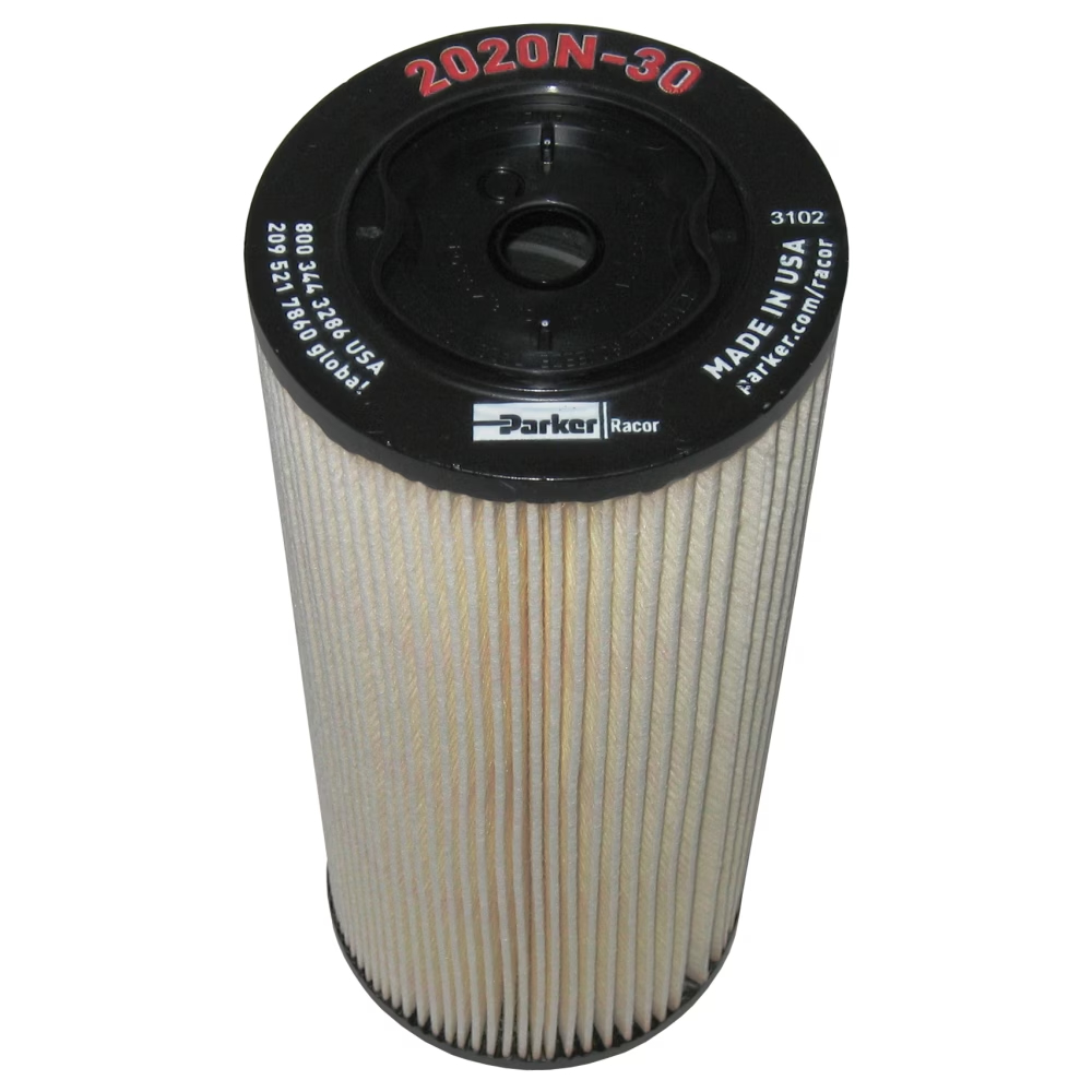 30‑micron Aquabloc cartridge for the Racor 1000 Turbine Series that offers exceptional water removal efficiency, low fuel restriction and high dirt‑holding capacity. Fuel is filtered in three stages: the turbine centrifuge separates large water droplets; coalescing stages allow smaller droplets to bead up and drop out; and the proprietary Aquabloc media repels water and removes 98 % of contaminants at 30 µm. An integral bail handle enables quick, clean cartridge changes.